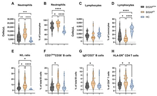 Comparison of cellular immune distributions between BISAPhi, BISAPlow, and HC groups at admission. Concentration and frequency of circulating neutrophils (A,B) and lymphocytes (C,D). (E) N/L ratio. (F–H) frequency of CD21lowCD38− B cells (F), IgD−CD27− B cells (G), and HLA-DR+ CD4+ T cells (H). Violin plots represent median ± IQR. Significance determined by one-way ANOVA. * p < 0.05; ** p < 0.01; *** p < 0.001; **** p < 0.0001. N/L, neutrophil/lymphocyte.