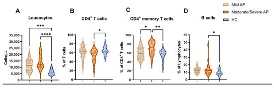 Comparison of cellular immune distributions between mild AP, moderate/severe AP, and HC groups at admission. Concentration of circulating leucocytes (A) and frequency of circulating CD4+ T cells (B), CD4+ memory T cells (C), and B cells (D). Violin plots represent median ± IQR. Significance determined by one-way ANOVA. * p < 0.05; ** p < 0.01; *** p < 0.001; **** p < 0.0001. AP, acute pancreatitis; HC, healthy control.