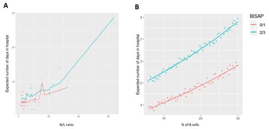Prediction of the expected number of days of hospitalization in the analyzed cohort of patients with low and high BISAP scores based on (A) N/L ratio and (B) % of B cells.