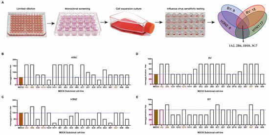 Sensitivity of MDCK subclone cells to the influenza virus. (A) Schematic diagram of the subclone isolation and screening process for MDCK cells; MDCK cell clones with increased sensitivity to four influenza viruses underwent subsequent screening. Hemagglutination titers of different subclones to influenza viruses of H1N1 (B), H3N2 (C), BY (D), and BY (E).