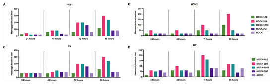 Second screening of candidate subclone cells. (A) Hemagglutination titers of the H1N1, (B) H3N2, (C) BV, and (D) BY influenza viruses at different infection times in MDCK and MDCK subclones.