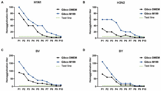 A critical element that influences viral development is the culture media. We compared the impacts of Gibco DMEM (CAT# 12800-017) and Gibco M199 (CAT# 31100-035) on the titers of four viruses in MDCK-2B6 cells to establish the best growth medium for this purpose. The influenza virus hemagglutination titer discovered at 72 h after the virus injection in MDCK-2B6 cells. The findings revealed that the H1N1, BV, and BY titers were more significant in the M199 maintenance solution, whereas there were no discernible differences in the H3N2 titers (Figure 3). To assess the stability of the virus passage, the virus was constantly passed under two distinct media conditions. The results showed that the stability of the influenza virus reduced as the passage number of subcultures increased in both media, but the virus titer remained higher in the M199 medium than in DMEM, indicating that the M199 medium is better suited for influenza virus growth.
