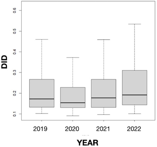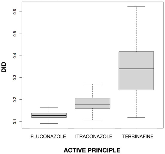 The mean values of DID for fluconazole, itraconazole, and terbinafine were 0.129, 0.187, and 0.336, respectively. The difference in the mean DID between the three drugs was statistically significant (p < 0.001). In Figure 1, a clear difference between drugs can be observed, with a higher value (both in the median and in the box as a whole) for terbinafine and a lower value for fluconazole and itraconazole, and also a different dispersion, with greater variability for terbinafine and much less variability for the imidazole derivatives. The fact that terbinafine was the most used antifungal is in line with the finding of Baştuğ et al. [38] in Turkey, where, with a rate of 66.6% in outpatient care, it was the most used agent, followed by itraconazole (20.8%) and fluconazole (11.9%). Terbinafine, itraconazole, and fluconazole were found to have a mean DID level of 1.057, 0.329, and 0.188, respectively, among outpatients. On the other hand, terbinafine was the most commonly used antifungal agent and the second most commonly used antifungal agent in high-income and middle-income countries, respectively [39]. This is congruent with the high prevalence of superficial nail and skin fungal infections and the importance of using this drug in their treatment [10,32].