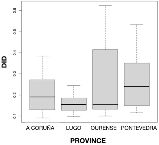 The distribution of DID by provinces can be seen in Figure 2, and the mean values of DID by the active principle and province can be seen in Table 1. The results obtained showed statistically significant differences (p < 0.001) in the mean DID values between the four Galician provinces, with the highest and lowest consumption found in Pontevedra (0.255) and Lugo (0.162), respectively. But no particular geographical pattern was noted.