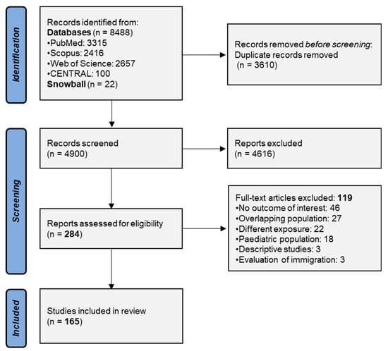 The process of study selection is schematically illustrated in Figure 1. After the removal of duplicate electronic papers, 4900 articles were screened for eligibility and 284 of them were retrieved as full texts. Then, 119 studies were excluded due to the lack of reporting of any of the outcomes of interest (n = 46), the inclusion of overlapping populations with other included studies (n = 27), the assessment of different exposures (n = 22), the inclusion of pediatric participants (n = 18), the evaluation of immigration (n = 3) or due to their descriptive study design (n = 3) (Supplementary Table S1, Supplementary S2). As a result, a total of 165 studies were included in this review.