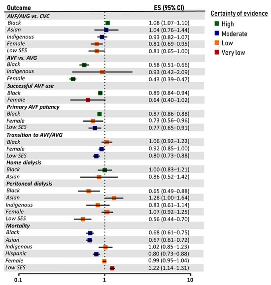 Forest plot and certainty of evidence of dialysis-related outcomes. White, male and high socioeconomic status patients served as the reference groups. Effect size corresponds to hazard ratio for primary AVF patency and mortality and to odds ratio for the other endpoints. ES: effect size; CI: confidence intervals; SES: socioeconomic status; AVF: arteriovenous fistula; AVG: arteriovenous graft; CVC: central venous catheter.