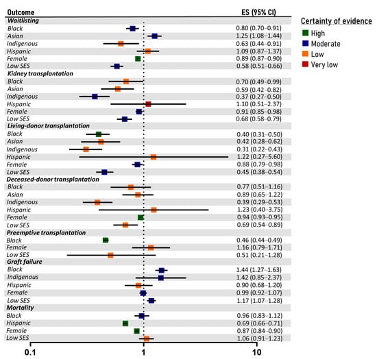 Forest plot and certainty of evidence of kidney transplantation-related outcomes. Effect size corresponds to hazard ratio for graft failure and mortality and to odds ratio for the other endpoints. White, male and high socioeconomic status patients served as the reference groups. ES: effect size; CI: confidence intervals; SES: socioeconomic status.