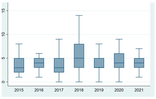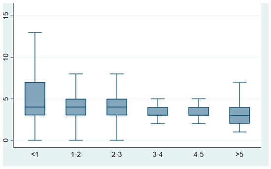 The length of stay was significantly different across the years, ranging from 3 days (2–5) in the year 2015 to 5 days (3–8) in the year 2017 (Kruskall–Wallis test p-value = 0.002), as shown in Figure 2. The year 2018 also showed a large variability in LOS, ranging from 1 to 14 days of admission.