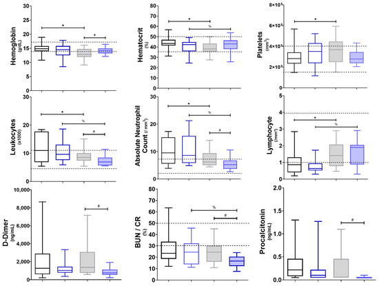 Blood biometry cell counts pre- and post-treatment. Markers of infection, inflammation, and tissue damage. Gray boxes represent untreated patients (n1), while blue boxes represent patients supplemented with O3FAs (n2); the left (blank) shows individuals pre-treatment, and the right (filled) shows individuals post-treatment. *,#,% p < 0.05 against the group indicated in the extremes of the horizontal bars: * p < 0.05 between before and after the study period in the untreated group; % p < 0.05 between before and after the study period in the supplemented group; # p < 0.05 between the final state of both the treated and untreated groups. Abbreviation: BUN/CR = Blood Ureic Nitrogen/Creatinine ratio.