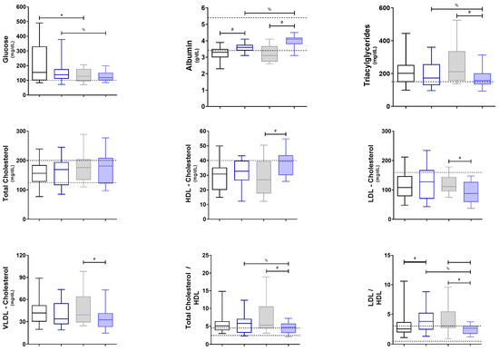 Markers of general metabolism. Gray boxes represent untreated patients (n1), while blue boxes represent patients supplemented with O3FAs (n2); the left (blank) shows individuals pre-treatment, and the right (filled) shows individuals post-treatment. *,#,% p < 0.05 against the group indicated in the extremes of the horizontal bars. HDL = High-Density Lipoproteins, LDL = Low-Density Lipoproteins, VLDL = Very Low-Density Lipoproteins.
