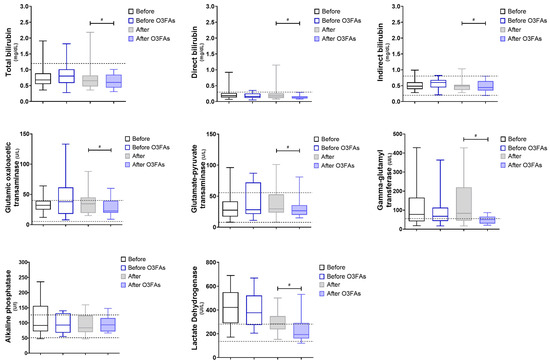 Liver function. Metabolites and enzymes as markers of liver function. Gray boxes represent untreated patients (n1), while blue boxes represent patients supplemented with O3FAs (n2); the left (blank) shows individuals pre-treatment, and the right (filled) shows individuals post-treatment. # p < 0.05 against the group indicated in the extremes of the horizontal bars.