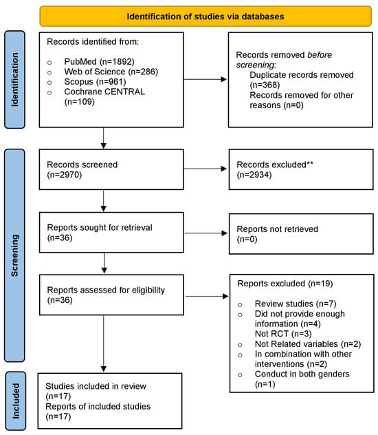 A flow diagram outlining the search of information sources and study selection is presented in Figure 1. Finally, 17 RCTs [24,27,28,29,30,31,32,33,34,35,36,37,38,39,40,41,42] were incorporated into the meta-analysis, accounting for 1774 men (957 in the intervention group and 817 in the control group). The trial’s main features are summed up in Table 1. Sample sizes in the included RCTs fluctuated from 23 to 307 participants, and the mean participant age fluctuated from 20 to 72 years. Seven studies focused on infertile men or those with reproductive disorders, six studies included healthy males, two studies involved patients with severe vitamin D deficiencies, one study examined heart failure patients, and one study focused on overweight men. The dosage of supplementary vitamin D in the treated arms of the 17 included trials varied from 580 to 8500 IU/day. The period of vitamin D supplementation ranged from as low as 8 weeks to as high as 96 weeks.