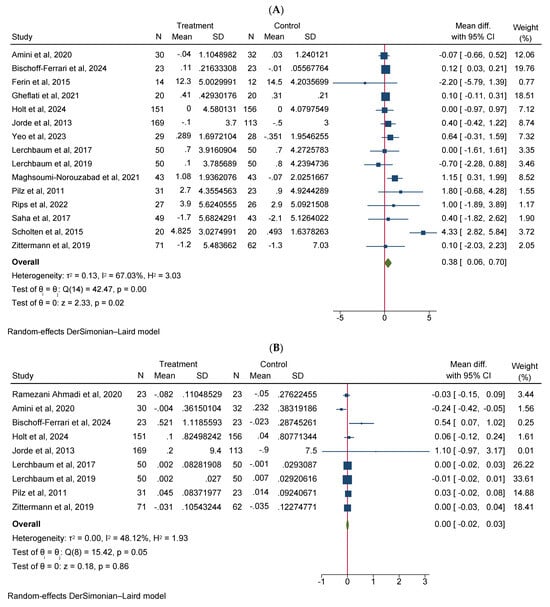 Vitamin D supplementation significantly increased total testosterone levels (WMD 0.38, 95% CI 0.06–0.70, n = 15, I2 = 67.03) (Figure 2A). Our subgroup analysis indicated that this effect was significant for durations of more than 12 weeks and vitamin D supplementation of more than 4000 IU/day compared to durations of 12 weeks or less and the supplementation of 4000 IU/day or less, respectively. We also observed in our subgroups that senior adults showed a significant increase in total testosterone after vitamin D supplementation compared to other age groups (Table 2). Our meta-analysis results indicated that vitamin D supplementation did not show any significant impact on other reproductive hormone parameters, such as free testosterone (WMD 0.00, 95% CI −0.02–0.03, n = 9, I2 = 48.12) (Figure 2B), FSH (WMD −0.02, 95% CI −0.57–0.53, n = 7, I2 = 48.72) (Figure 2C), LH (WMD −0.09, 95% CI −0.30–0.12, n = 8, I2 = 0.00) (Figure 2D), SHBG (WMD 0.73, 95% CI −1.14–2.61, n = 10, I2 = 69.05) (Figure 2E), estradiol (WMD −0.02, 95% CI −2.95–2.92, n = 5, I2 = 20.63) (Figure 2F), and FAI (WMD −0.92, 95% CI −2.12–0.27, n = 6, I2 = 0.00) (Figure 2G). However, our dose–response analysis indicated that there was an opposite correlation between the vitamin D dose and FSH levels, and there was also an opposite correlation between the duration of vitamin D supplementation and FAI levels. Additionally, we observed in our dose–response meta-analysis that a rise in the duration of vitamin D supplementation significantly correlated with free testosterone levels (Supplementary File S2).