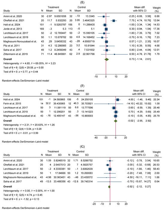 Meta-analysis of the effect of vitamin D supplementation on the endpoints: (A) total testosterone, (B) free testosterone, (C) FSH, (D) LH, (E) SHBG, (F) estradiol, and (G) FAI.