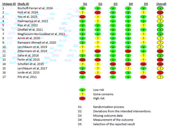 - Sterne, J.A.C.; Savović, J.; Page, M.J.; Elbers, R.G.; Blencowe, N.S.; Boutron, I.; Cates, C.J.; Cheng, H.Y.; Corbett, M.S.; Eldridge, S.M.; et al. Rob 2: A revised tool for assessing risk of bias in randomised trials. Bmj 2019, 366, l4898. [Google Scholar] [CrossRef]