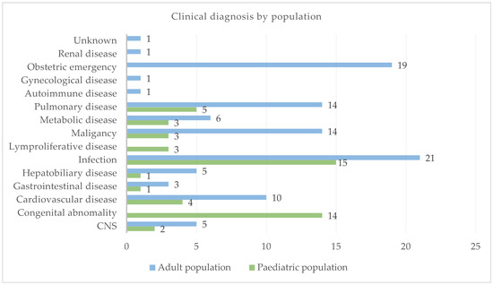 Infection (n = 15; 29.41%), congenital abnormalities (n = 14; 27.45%), and pulmonary diseases (n = 5; 9.80%) were the most frequent clinical diagnoses in the paediatric population, whereas infection (n = 21; 20.79%), obstetric emergencies (n = 19; 18.81%), pulmonary diseases (n = 14; 13.86%), and malignancies (n = 14; 13.86%) were the most common clinical diagnoses in the adult population (See Figure 2).