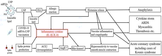 Autopsy data have shown that deaths most frequently occur on the same or next day following the administration of COVID-19 mRNA-lipid nanoparticle (LNP) vaccines, with cardiovascular events accounting for approximately half of the deaths [1]. While these adverse events are typically attributed to allergic reactions with conventional vaccines, COVID-19 mRNA-LNP vaccines have been associated with an incidence of deaths due to cytokine storms [2,3,4,5]. These events are thought to be driven by cytokine storms induced by LNPs and the spike proteins themselves [6,7,8] or allergic responses such as Kounis syndrome [9] (Figure 1). Additionally, the SARS-CoV-2 spike protein binds to angiotensin-converting enzyme 2 (ACE2) and downregulates its expression, which increases the level of angiotensin II (AngII) [10]. AngII and IL-1β upregulate the activity of Rho-kinase, resulting in hypersensitivity to vascular smooth muscle contraction [11] (Figure 1).
