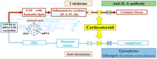 Specific treatments for immediate and short-term reactions to COVID-19 mRNA-LNP vaccinations. Contrary to conventional vaccines, treatment strategies following the administration of COVID-19 mRNA-LNP vaccines must consider allergic reactions and the cytokine release mechanism. In light of the challenges of distinguishing between a cytokine storm and anaphylaxis, corticosteroids are recommended as a treatment option to address both conditions. mRNA = messenger RNA; LNP = lipid nanoparticle; PEG = polyethylene glycol; IL = interleukin.