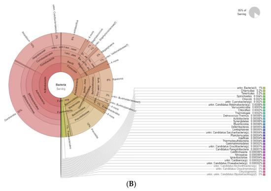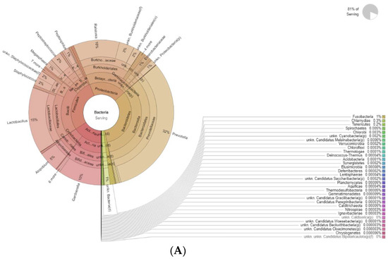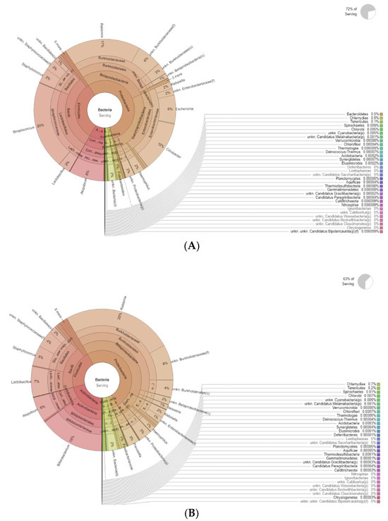 Krona plots showing differences in bacteria genera belonging to the vaginal microbiota. (A) PMP before treatment (T0), (B) PMP after treatment (T1).