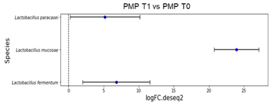 Indeed, three different species of Lactobacillus were overrepresented after treatment (p < 0.001): L. fermentum (LogFC = 6.78), L. mucosae (LogFC = 23.96), and L. paracasei (LogFC = 5.19) in the PMP cohort.