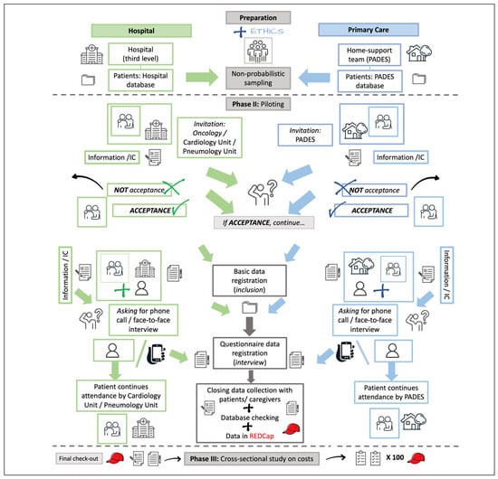 Flowchart of the intended route to recruit and interview patients and caregivers from hospital attention and home care teams. PADES: Programa de Atención Domiciliaria y Equipos de Soporte; IC: Informed Consent (part of the images used were taken from iStock [free images]; https://www.istockphoto.com/es).