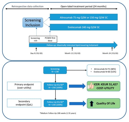The present study aims to investigate the cost–utility and quality of life outcomes of PCSK9 inhibitors using prospectively collected data from 158 patients over a 24-month follow-up period. The primary objective of this study is to assess the cost–utility of PCSK9 inhibitors, while the secondary objective was to evaluate changes in quality of life measured through the different domains of the EQ-5D-3L questionnaire. By examining these comprehensive measures, this study aims to provide valuable insights into the economic impact and utility of PCSK9 inhibitors in real-world clinical practice, building upon the findings from the MEMOGAL study (ClinicalTrials.gov Identifier: NCT04319081).