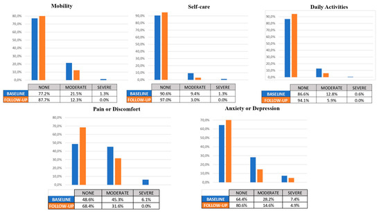 Finally, regarding the baseline assessment of anxiety or depression domain, the distribution of symptoms among patients was as follows: 64.4% reported no anxiety or depression, 28.2% had moderate levels of anxiety or depression, and 7.4% experienced severe levels. However, at follow-up, the distribution shifted significantly, with 80.6% of patients reporting no anxiety or depression, 14.6% experiencing moderate levels, and 4.9% reporting severe levels. This observed improvement in anxiety or depression outcomes was statistically significant (p < 0.001).