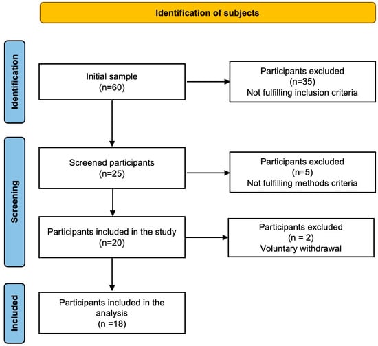 Sixty older adults were invited to participate in a cross-sectional study for convenience: 35 did not meet the inclusion criteria, 5 did not complete the tests, and 2 voluntarily left the study. Finally, 18 participants (10 men and 8 women) completed the study (Figure 1). The inclusion criteria were 65 years or older, non-smoker, no evidence of kidney or liver dysfunction, and engaging in less than five days of moderate-intensity physical exercise or less than 30 min of walking daily. The exclusion criteria included inability to follow protocol instructions, mobility issues, and failure to perform a maximum exercise test on a bicycle ergometer.