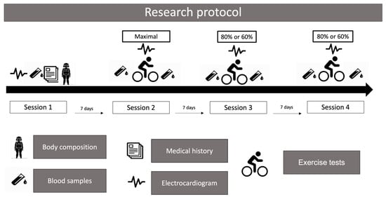 After an overnight fast, participants were required to visit the laboratory four times between 7:00 and 9:00 h (Figure 2). In the first session, a venous blood sample was collected, and a clinical history examination, a resting electrocardiogram, and a body fat percentage measurement (%BF) were performed. The second session involved a maximum exercise test under a standardized protocol [17]; the third and fourth sessions included two submaximal exercise tests at 80% or 60% of the maximal heart rate achieved during the maximum exercise test. Before each exercise test, participants drank 150 mL of water. The indoor environmental conditions during the exercise tests remained stable, with a temperature of 23 °C and relative humidity of 30%. In addition, the participants were instructed to wear sports attire.