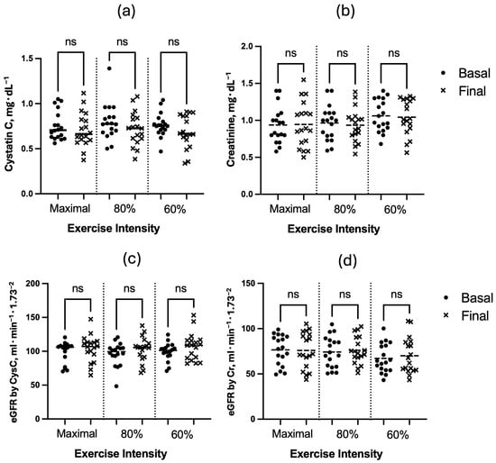 The strengths of this study include controlled experiments, examining three exercise intensities, utilizing both Cr and CysC for GFR estimation, and focusing on older adults. Cr as a biomarker for kidney function is influenced by factors such as stress, muscle mass, and dietary protein intake, which may be particularly relevant in older adults [41]. Conversely, CysC is less affected by these factors and may provide a more accurate estimation of the GFR [42]. However, both biomarkers could provide a more comprehensive assessment of the effect of acute exercise on kidney function.