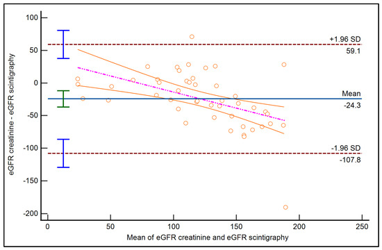 A regression analysis was performed to model the relationship between the two methods. The resulting regression equation was y = 35.49 − 0.49x, where y represents the eGFR from Method B (Scintigraphy), and x represents the eGFR from Method A (Creatinine).
