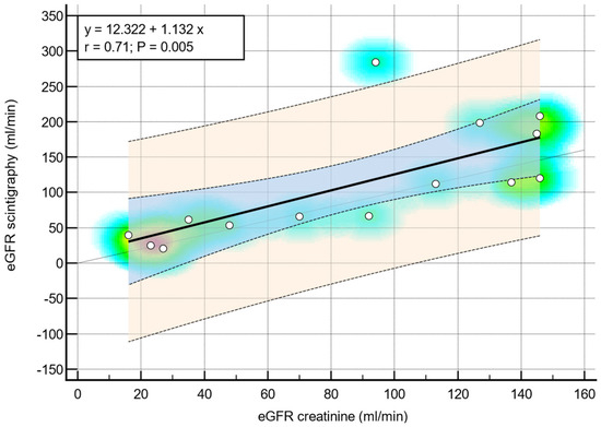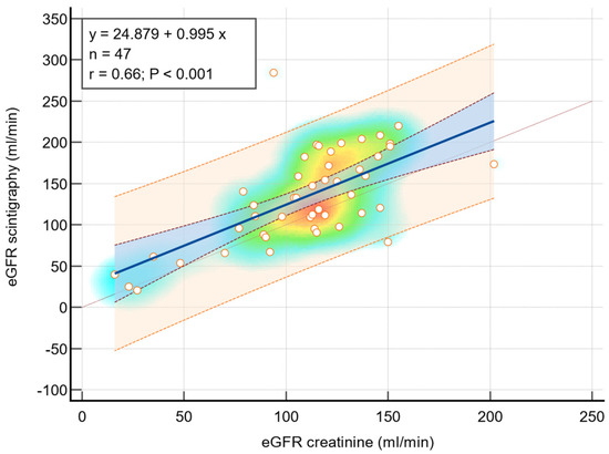 Strong positive linear correlation between eGFR scintigraphy and eGFR creatinine in children with CAKUT on both sides—scatter diagram with heat map. The background color coding indicates density of points, suggesting clusters of observations. The red color indicates a high concentration of points, yellow indicates a moderate concentration of points, and blue indicates a low concentration of points.