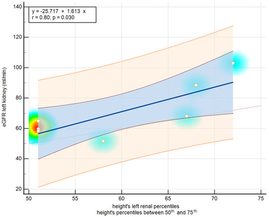 Scatter diagram of correlation left renal scintigraphy and height’s left renal percentiles for height’s percentiles between 50th and 75th—a strong positive linear correlation.