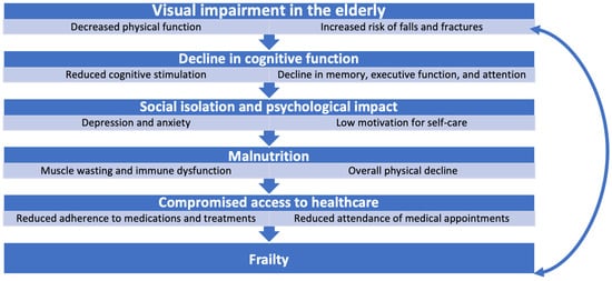 Visual impairment can create significant barriers to healthcare access, which, in turn, exacerbates frailty in elderly individuals. People with vision loss may face difficulties managing their medications, attending medical appointments, or following healthcare recommendations. This issue is particularly problematic when compounded by cognitive impairments, as many visually impaired elderly individuals struggle to follow and adhere to complex health regimens [15]. The inability to effectively manage chronic health conditions leads to the worsening of comorbidities, more frequent hospitalisations, and a more rapid decline into frailty. A study by Hou and Pu [54] demonstrated that individuals with visual impairments are more likely to use healthcare services more frequently but often experience delays in receiving necessary interventions such as cataract surgery due to logistical challenges and barriers to accessing timely care. These logistical challenges include the financial burden posed by medical costs associated with visual impairment, particularly for individuals from lower socioeconomic backgrounds who may lack adequate insurance coverage. Patients with visual disabilities also have a higher predicted use of ophthalmic care, increasing wait times and straining healthcare systems. In addition, geographical barriers, particularly in rural areas, exacerbate delays, as patients often need to travel long distances to access care, further delaying necessary interventions such as cataract surgery [54]. These factors contribute to a cycle of health deterioration where untreated conditions exacerbate frailty and increase the risk of adverse outcomes. Visual impairment increases the difficulty of navigating healthcare systems, further complicating the management of chronic diseases. Cupples et al. [55] emphasise the need for tailored interventions to improve healthcare access for individuals with visual impairments, noting that a lack of accessible health information, such as medication instructions in large print or audio formats, impedes the ability of patients to adhere to their treatment regimens. This lack of accessible healthcare resources contributes to poorer health outcomes and accelerates frailty and vision–cognitive impairment (Figure 2). While audio formats and large print are valuable, other accessible formats like Braille can significantly enhance cognitive development in visually impaired individuals, as reading and writing in Braille engages different cognitive pathways compared to listening alone [55,56]. This underscores the need for tailored interventions that not only provide accessible health information but also promote cognitive development through diverse formats.