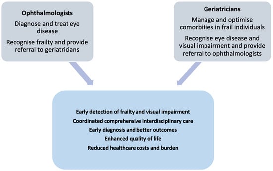 Given the economic burden of vision–cognitive impairment, collaboration between ophthalmologists and geriatricians could enhance the provision of comprehensive care for this vulnerable subset of the population affected by both frailty and vision–cognitive impairment. With an interdisciplinary approach, care models that encourage collaboration between these specialities have the potential to lead to earlier detection, holistic management, and improved outcomes for both frailty and vision–cognitive impairment. Integrating tools for the recognition and assessment of frailty and eye disease into routine ophthalmological and geriatric care, respectively, can help clinicians to identify individuals at risk and intervene earlier to mitigate the implications of both visual impairment and frailty, therefore improving health outcomes, reducing healthcare costs, and improving the well-being of elderly patients [22,23,24].