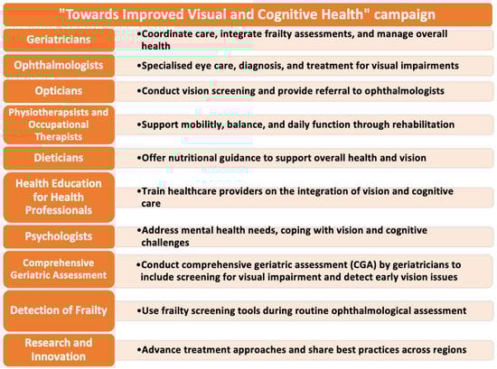 Heath education and increasing awareness among the public and healthcare professionals of the value of the campaign “Towards Improved Visual & Cognitive Health” are important (Figure 4). Dieticians and psychologists may play crucial roles in mitigating the impact of visual decline. Their roles can be extended to teach relatives about the best strategies to help in minimising cognitive decline. In addition to curriculum advancements, large-scale interventional studies are needed to assess the role of emerging technologies, such as mobile devices, in stimulating cognitive and brain function in elderly individuals with visual impairment. Mobile health applications, virtual reality, and brain stimulation technologies are promising tools for maintaining cognitive engagement and improving outcomes for this population. Further research should also explore the potential of other innovative interventions, such as telemedicine, wearable devices, and AI-driven diagnostic tools, to enhance vision care in older adults (Figure 4).
