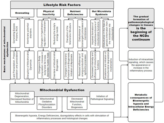 This scheme is an attempt to graphically display a simplified model of the mechanisms of the relationship between the basic risk factors of NCDs associated with unhealthy diet and physical inactivity, and the occurrence of NCDs through the mechanisms of MD. When analyzing the presented promising scheme of the basic mechanisms of MD at the stage of formation of NCDs’ risk factors, we can note the emergence, according to the scientific literature, of two new important risk factors for the occurrence of NCDs: nutritional deficiencies and gut microbiota dysbiosis. The participation of these risk factors, together with overeating and physical inactivity, leads to the occurrence of MD, which at this stage is manifested by mitochondrial degeneration and a decrease in the number of mitochondria, impaired oxidative phosphorylation in mitochondria, initiation of pathological signaling processes, etc. A fundamentally important point is the fact that MD leads to a pathological change in the energy state of the cell, initiating dysregulatory effects and inflammatory processes in the tissues of the human body. This becomes the basis of the “pathological circle” for the gradual occurrence of pathomorphological changes in tissues and organs and is the conditional beginning of the emergence of NCDs’ pathology, which is shown on the right side of the scheme. The term “NCDs continuum”, which is used in the scheme, will be described further in the text.