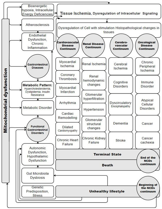 The prototype of this scheme is the Cardiovascular Disease Continuum scheme, which was developed by V. Dzau and E. Braunwald [22,23,24,25,26,27,28]. The scheme presented in the review is a working model and an attempt to describe the systemic relationship between the development of all groups of NCDs in the whole organism, taking into account the role of MD. It is logical that NCDs’ risk factors (unhealthy lifestyle) are at the beginning of the continuum and lead to the occurrence of MD. As practical experience shows, functional gastrointestinal disorders and gastrointestinal diseases create the metabolic basis for the development of many pathogenetic mechanisms of NCDs (endothelial dysfunction, chronic inflammation, atherosclerosis, etc.). This leads to specific pathological changes in the tissues of the corresponding organs. Exactly how this happens and why different combinations of NCDs occur in different patients continues to be studied. This is an important and not fully understood issue for modern medicine. But it is certainly obvious from the literature that mitochondrial dysfunction leads to these pathological continuums in different tissues, and this depends on the influence of NCDs’ risk factors.