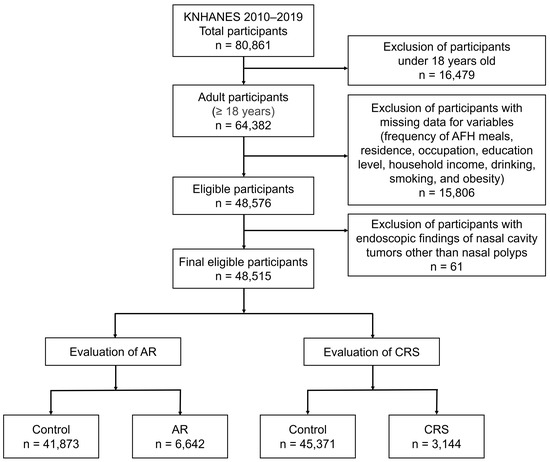 Statistical Analysis System version 9.4 (SAS Institute, Inc., Cary, NC, USA) was used for statistical analyses. The baseline characteristics of the participants were investigated using Student’s t-test for continuous variables, such as age, and the chi-squared test for categorical variables. To evaluate the association between the frequency of AFH meals and AR or CRS, univariable and multivariable logistic regression analyses were performed. In each AFH meals group, the odds ratio (OR) and 95% confidence interval (CI) for AR or CRS were measured, and the statistical significance level was set at p < 0.05. In the multivariable logistic regression analysis, covariates with significant effects (p < 0.25) in the univariate logistic regression analysis were adjusted as confounding factors to avoid omitting their potentially relevant effects. Among the participants with AR, subjective symptoms, serum IgE levels, and endoscopic findings were analyzed according to the frequency of AFH meals. Similarly, for the participants with CRS, subjective symptoms and endoscopic findings were analyzed according to the frequency of AFH meals to find any statistical differences between the AFH meals groups.