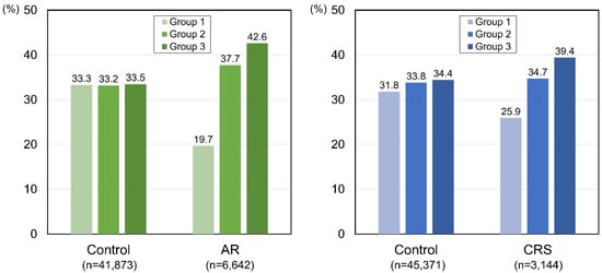 Percentages of groups 1, 2, and 3 among the controls and the participants with AR, and among the controls and the participants with CRS. Group 1, the participants who had AFH meals less than once a week; group 2, one to four times a week; group 3, five times a week or more. AR, allergic rhinitis; CRS, chronic rhinosinusitis.