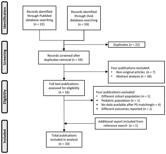 Figure 1 presents the detailed sorting process of the publications included in the meta-analysis for a total of ten retrospective and PSM studies [,,,,,,,,,]. The main characteristics of the studies included in the meta-analysis are reported in Supplementary Table S2. No direct contact with the authors of the included studies was required for this meta-analysis. Supplementary Table S3 reports the PRISMA 2020 checklist.