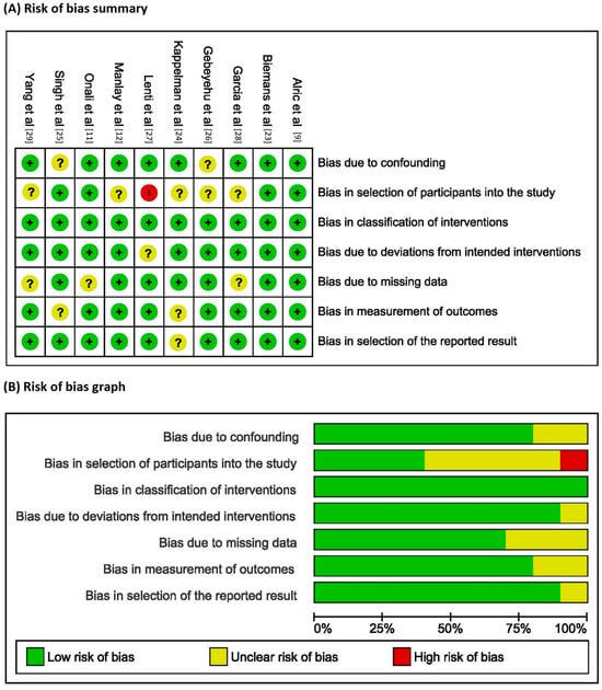 The detailed bias analysis is shown in Supplementary Table S4. None of the included studies was judged to be at critical risk of bias, but only two studies received a low risk of bias judgment. Seven out of ten studies were considered at moderate risk of bias, while one study received a high risk of bias judgment. Figure 2A shows the risk of bias summary, which reports the authors’ judgment about each risk of bias item for each included study, while the risk of bias graph, which reports review authors’ judgments about each risk of bias item across all included studies, is shown in Figure 2B.