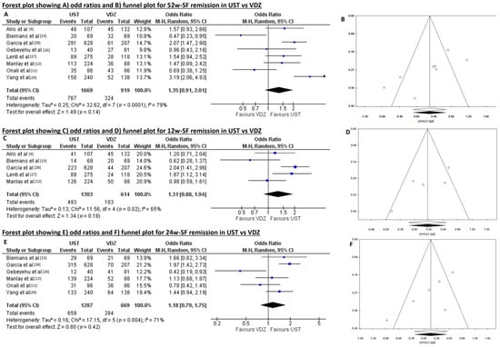 (A) Forest plot showing odd ratios and (B) funnel plot for 52 weeks (w) steroid-free remission (SF). (C) Forest plot showing odds ratios and (D) funnel plot for 12w-SF remission. (E) Forest plot showing odds ratios and (F) funnel plot for 24 w-SF remission in ustekinumab (UST) and vedolizumab (VDZ).