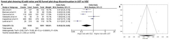 The rate of drug discontinuation was reported in six studies for a total of 3029 patients, with a lower risk in patients treated with UST (n = 695/1938, 35.9%) than in those who received VDZ (n = 581/1091, 53.3%) in the non-weighted baseline analysis. When data were pooled, there was high heterogeneity (Tau2 = 0.69, p = 0 < 0.001, I2 = 93%), but the risk of publication bias using Begg’s (p = 0.573) and Egger’s (p = 0.378) tests was low, and the funnel plot appeared symmetrical as confirmed by trim and fill test. The OR of drug discontinuation was 0.40 (95IC 0.20–0.80, p = 0.010) in the UST and VDZ comparison, meaning a significant difference of higher drug discontinuation risk in patients receiving VDZ (Figure 4A,B).