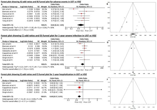(A) Forest plot showing odd ratios and (B) funnel plot for adverse events. (C) Forest plot showing odds ratios and (D) funnel plot for 1-year severe infection. (E) Forest plot showing odds ratios and (F) funnel plot for 1-year hospitalization in ustekinumab (UST) and vedolizumab (VDZ).