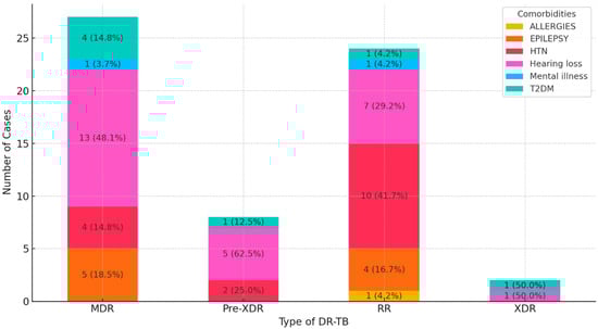 A total of six comorbidities were associated with DR-TB in the study’s population, including diabetes mellitus type 2 (T2DM), hypertension (HTN), hearing loss, epilepsy, mental illness, and allergies (Figure 1). Hearing loss and HTN are the most frequently observed comorbidities across the various types of DR-TB, particularly in MDR, RR, and Pre-XDR cases. Epilepsy and T2DM are also observed but to a lesser extent. Comorbidities such as mental illness and allergies are less common across all types of DR-TB. This distribution suggests that managing comorbidities such as hearing loss and HTN is critical for patients with DR-TB, especially for MDR and RR forms.