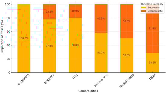 Over 55% of patients with epilepsy were cured, indicating a relatively positive treatment outcome. Approximately 38% of patients with hearing loss were cured. Among patients with HTN, 26.6% achieved a cure, showing a moderate cure rate compared to other comorbidities. While with mental illness, 50% were cured, suggesting that mental illness did not significantly hinder treatment success.