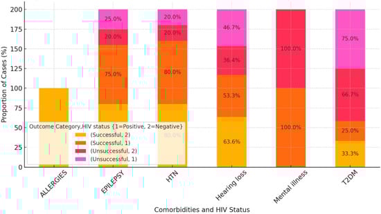 Patients with allergies and HTN comorbidities tended to have better treatment outcomes, regardless of HIV status. Comorbidities of epilepsy and hearing loss posed a greater risk, with significant proportions of both HIV-positive and negative patients experiencing unsuccessful outcomes. DR-TB patients with mental illness were associated with poor outcomes, particularly for HIV-negative patients, where half of the patients experienced unsuccessful treatment outcomes.