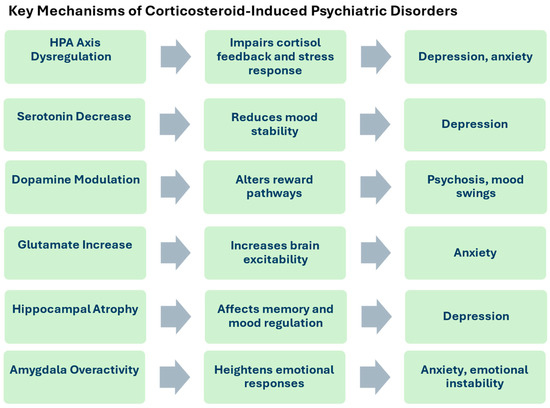 While physical side effects such as weight gain, osteoporosis, and fluid retention are well known, there is growing evidence that corticosteroids also pose substantial risks to mental health [6]. Psychiatric complications, ranging from mood disturbances to severe psychiatric disorders such as depression, anxiety, mania, and even psychosis, are often under-recognized by both the general public and healthcare providers [3]. Symptoms of corticosteroid-induced psychiatric complications typically include hallucinations, delusions, and paranoia. A longitudinal cohort study reported that psychiatric disturbances were more common in patients receiving higher doses of corticosteroids, with 18.6% of patients on more than 80 mg of prednisolone or methylprednisolone experiencing psychiatric symptoms, compared to 1.3% of patients on lower doses [7]. These symptoms usually appear within 3–4 days of starting corticosteroid therapy and often resolve within a week of discontinuation. These findings primarily reflect the effects of acute treatment. However, prolonged corticosteroid exposure can also pose significant psychiatric risks, with different symptom profiles emerging over time [8]. The correlated neuropsychiatric effects are believed to arise from the disruption of the hypothalamic–pituitary–adrenal (HPA) axis, a central stress response system that regulates cortisol levels in response to stress [9]. Prolonged corticosteroid exposure can lead to dysregulation of this system, contributing to a range of mental health disorders [10,11,12].