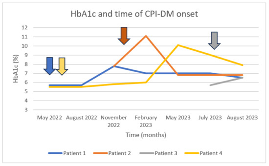 HbA1c levels at the time of CPI-DM diagnosis. Patient 1 treated with nivolumab and ipilimumab since May 2022, presenting inadequate glycemic control 5 months after the initiation of the combination treatment. Patient 2 treated with pembrolizumab since January 2023, presenting with elevated glucose levels one month after its initiation. Patient 3 treated with nivolumab in combination with oncolytic virus RP3; she was hospitalized due to DKA after the first administration of nivolumab (anti-PD-1). Patient 4 treated with pembrolizumab since May 2022, hospitalized due to DKA 12 months after the initiation of the anti-PD-1 treatment. The arrows represent the initiation of CPI-based treatment.